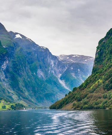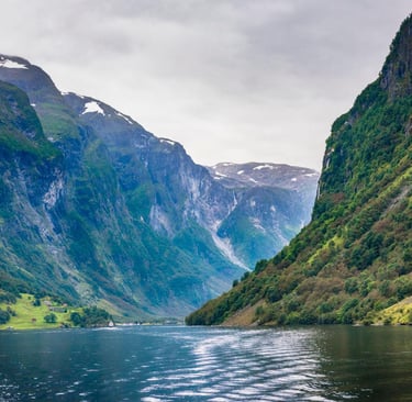 Travel through dramatic fjords such as Nærøyfjord, surrounded by towering cliffs.